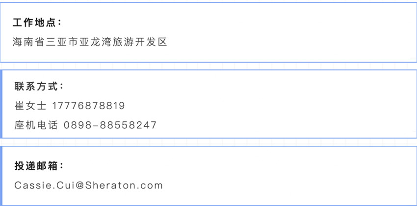 3.需要2至3年其他五星酒店同职位的工作经验,满3年的餐饮技术管理课程。