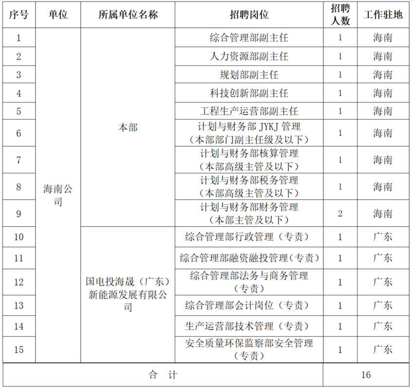 详见《国家电投集团海南电力有限公司本部及所属单位招聘岗位职责及任职条件》(附件1)。