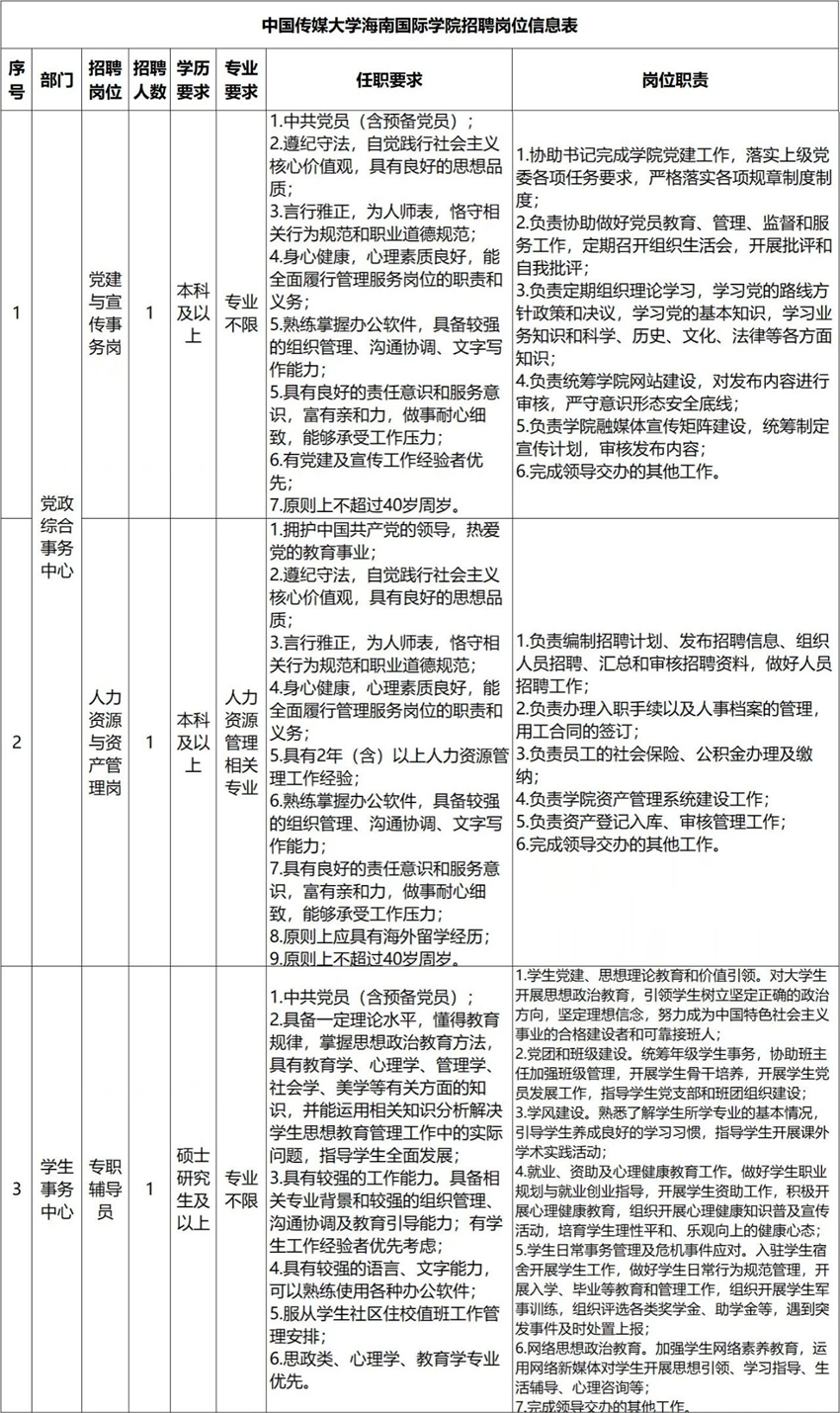 具体信息详见《中国传媒大学海南国际学院公开招聘岗位信息表》