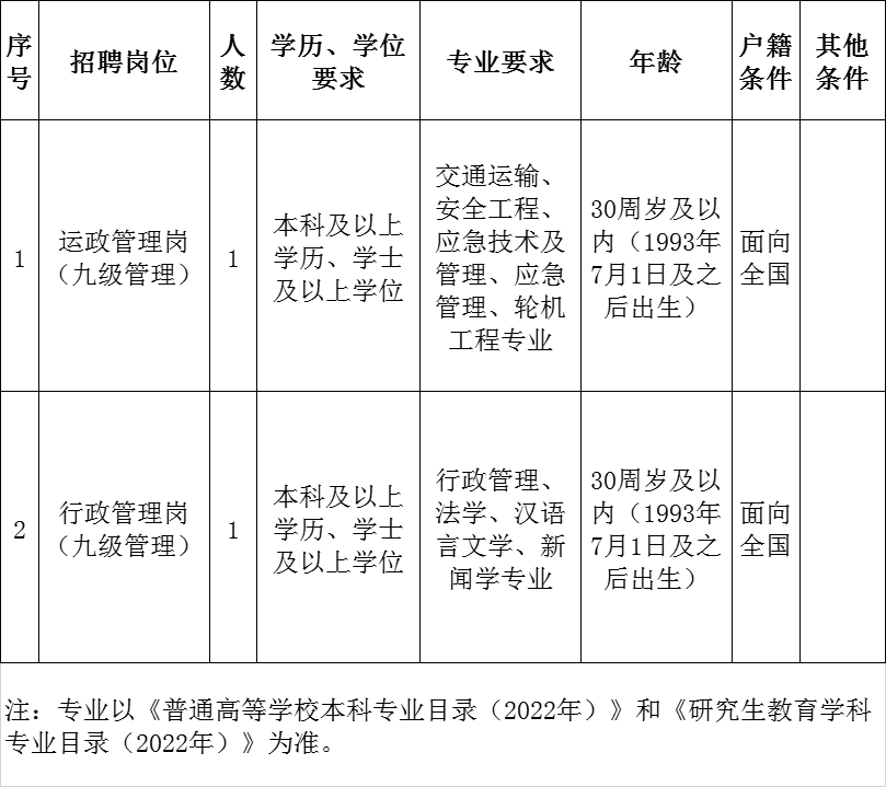 本次公开招聘事业编制人员共2人,其中运政管理岗、行政管理岗人员各1名,具体招聘岗位、职数及条件参见《海南省琼州海峡轮渡运输管理办公室2023公开招聘事业编制工作人员岗位表》(附件1)。