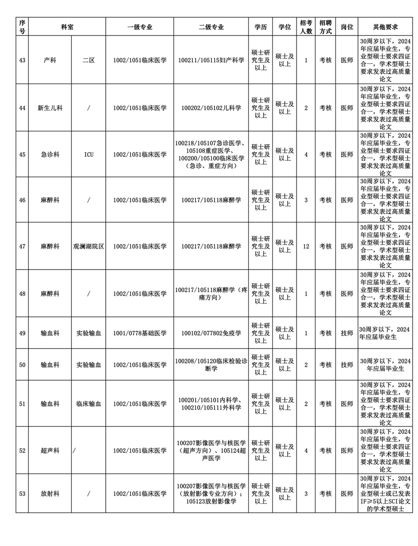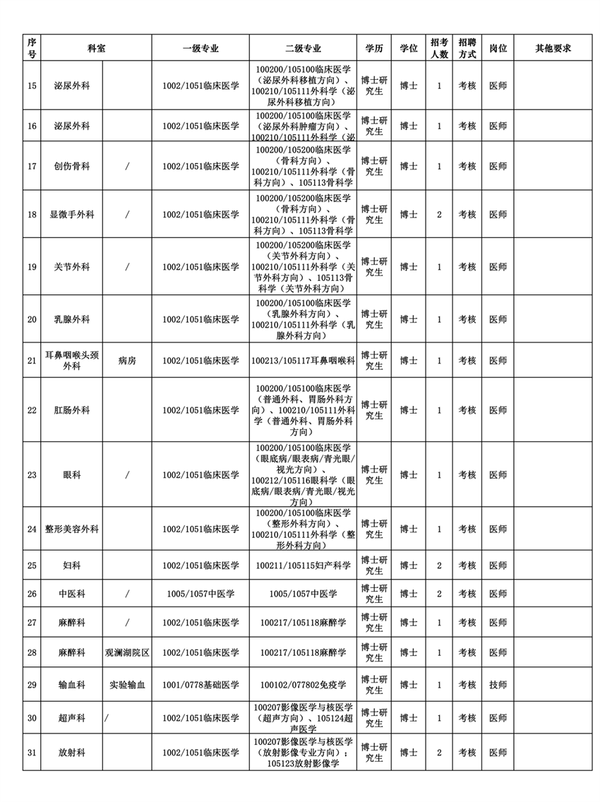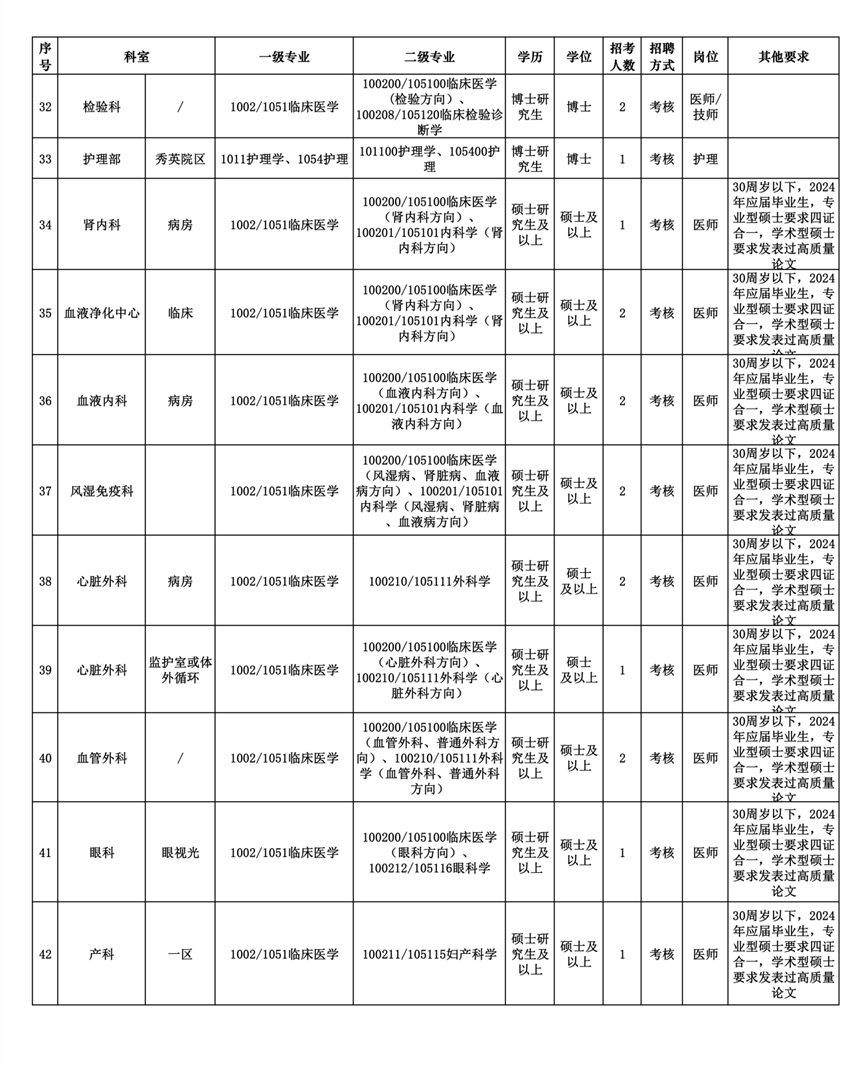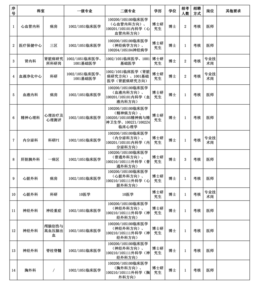 本次招聘专业技术人员共125名,具体详见《海南省人民医院2024年考核招聘专业技术人员职位表》(附件1)。学历学位要求为博士研究生、博士学位的岗位,面向社会全年公开招聘;学历学位要求为硕士研究生、硕士学位及以上的岗位,将在中南大学(长沙市)、华中科技大学(武汉市)、四川大学(成都市)、中山大学(广州市)进行校园招聘。报考博士研究生、博士学位岗位人员也可参加校园招聘。