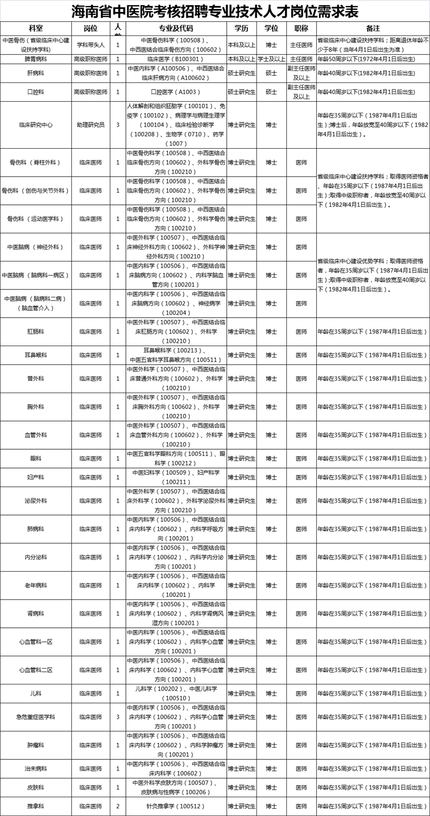 报考学科带头人岗位的考生,需具备:(1)主任医师资格,博士学位,从事中医骨伤临床、科学研究工作,在中华医学会或中华中医药学会相关专业委员会任常委及以上职务。(2)具有较好的业务能力及管理能力,能够履行岗位的医疗、科研、教学和管理职责;在中医骨伤学科领域取得突出的代表性学术成果,具有重要的学术影响力和较高的知名度。(3)符合海南自由贸易港高层次人才分类标准(2020)C 类及以上级别人才。(4)距离退休年龄不少于8年(当年4月1日后出生为准)。