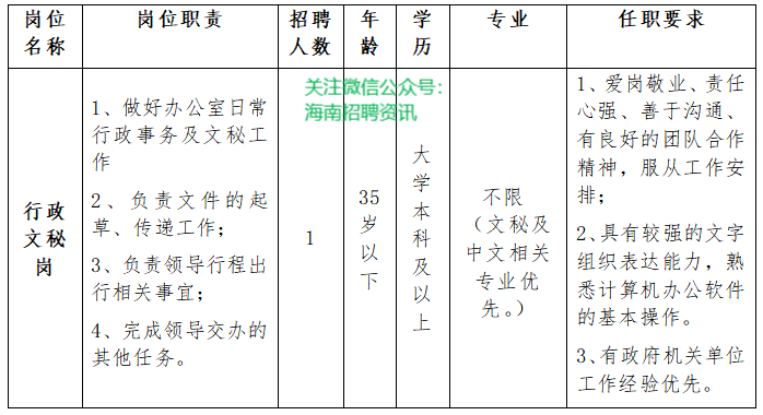 海南南海网人力资源开发有限公司接受委托向社会公开招聘1名工作人员派至文昌市某事业单位工作。现将有关事项公告如下: