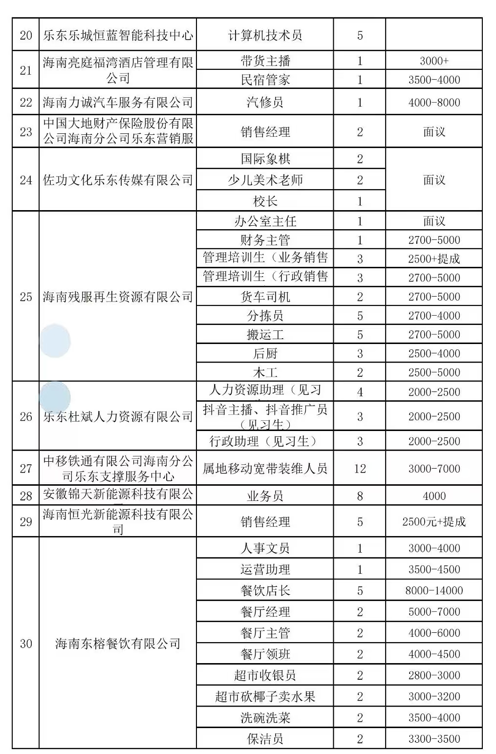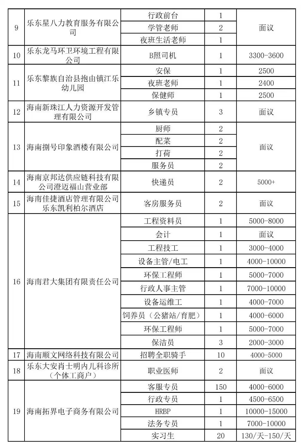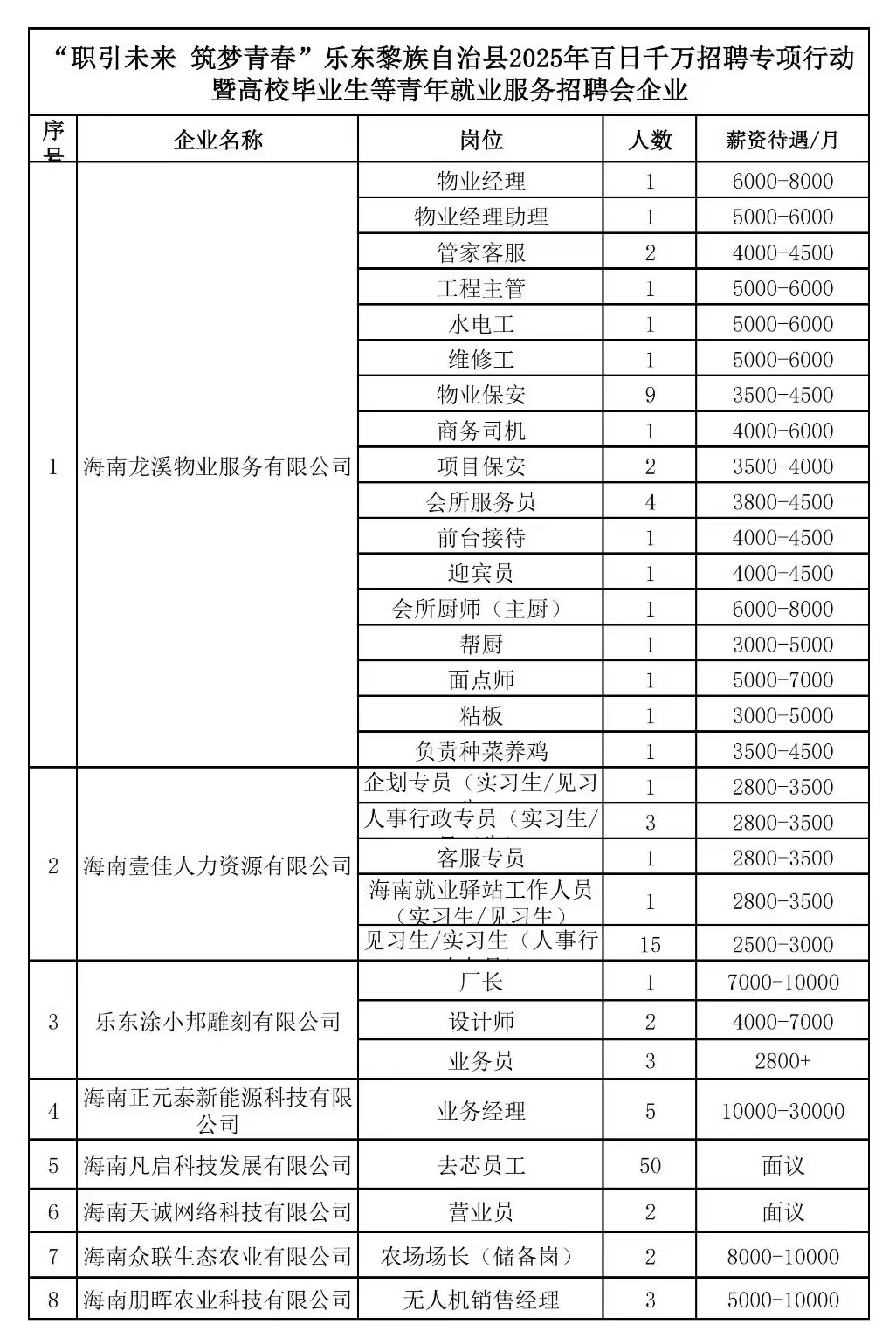 为贯彻落实《人力资源社会保障部办公厅关于开展第六届“百日千万招聘专项行动”的通知》(人社厅函〔2025〕86号)和《人力资源社会保障部办公厅关于开展2025年高校毕业生等青年就业服务攻坚行动的通知》(人社厅函〔2025〕103号)文件精神及要求,结合乐东县当地实情,为集中帮扶高校毕业生、退役军人、失业人员、农民工、零就业家庭成员及就业困难人员等各类求职群体,现定于2025年7月30日(周三)上午举办“职引未来 筑梦青春”乐东黎族自治县2025年百日千万招聘专项活动暨高校毕业生等青年就业服务招聘会。此次活动我们邀请了40多家乐东、三亚等地企业,给求职者提供500多个岗位,具体活动信息如下: