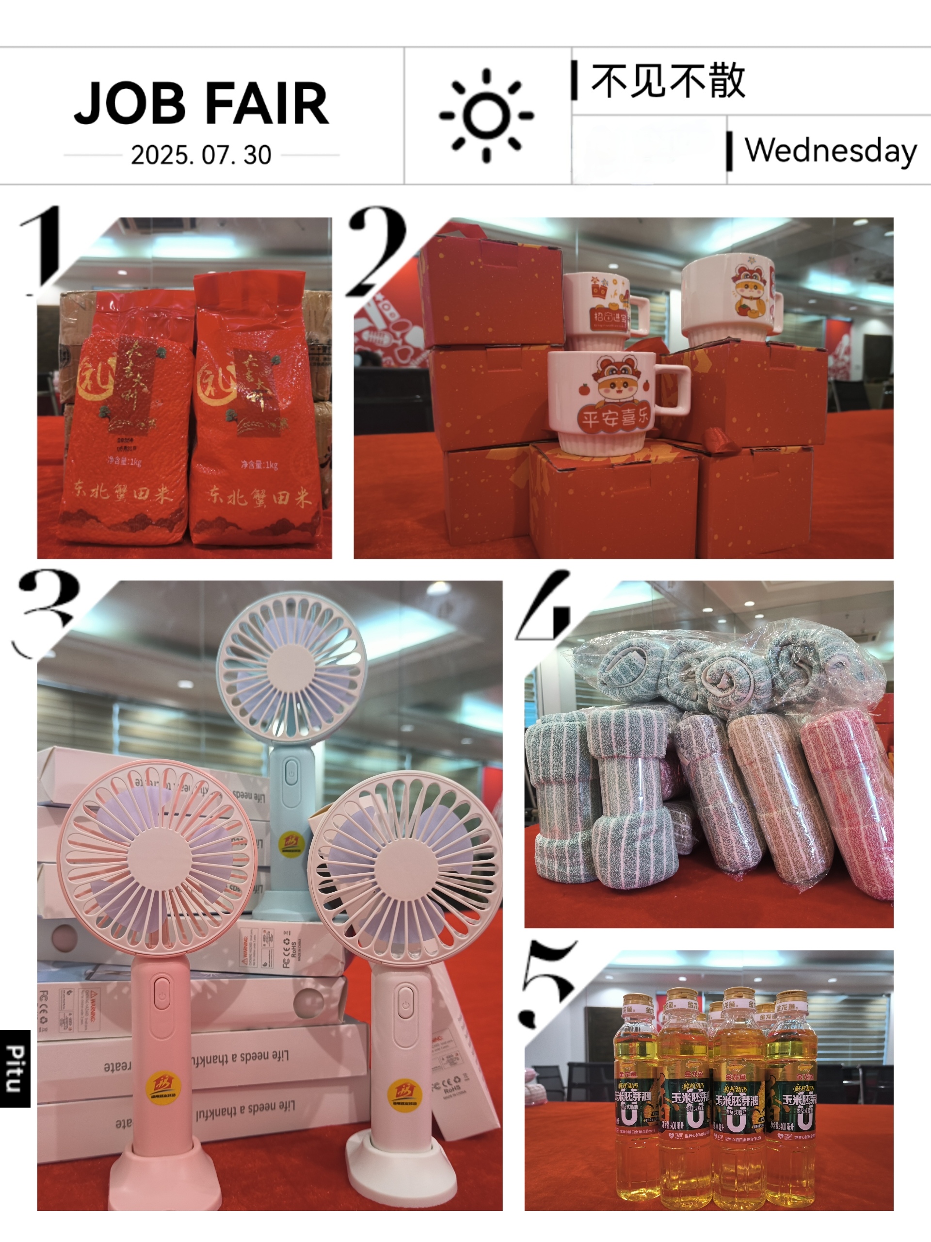 活动现场我们特别设置了“求职有礼”环节,只要在现场的求职登记处进行求职登记或投递简历,就能把我们的丰富礼品(大米、陶瓷杯、迷你小风扇、毛巾、玉米油)收入囊中打包带回家!