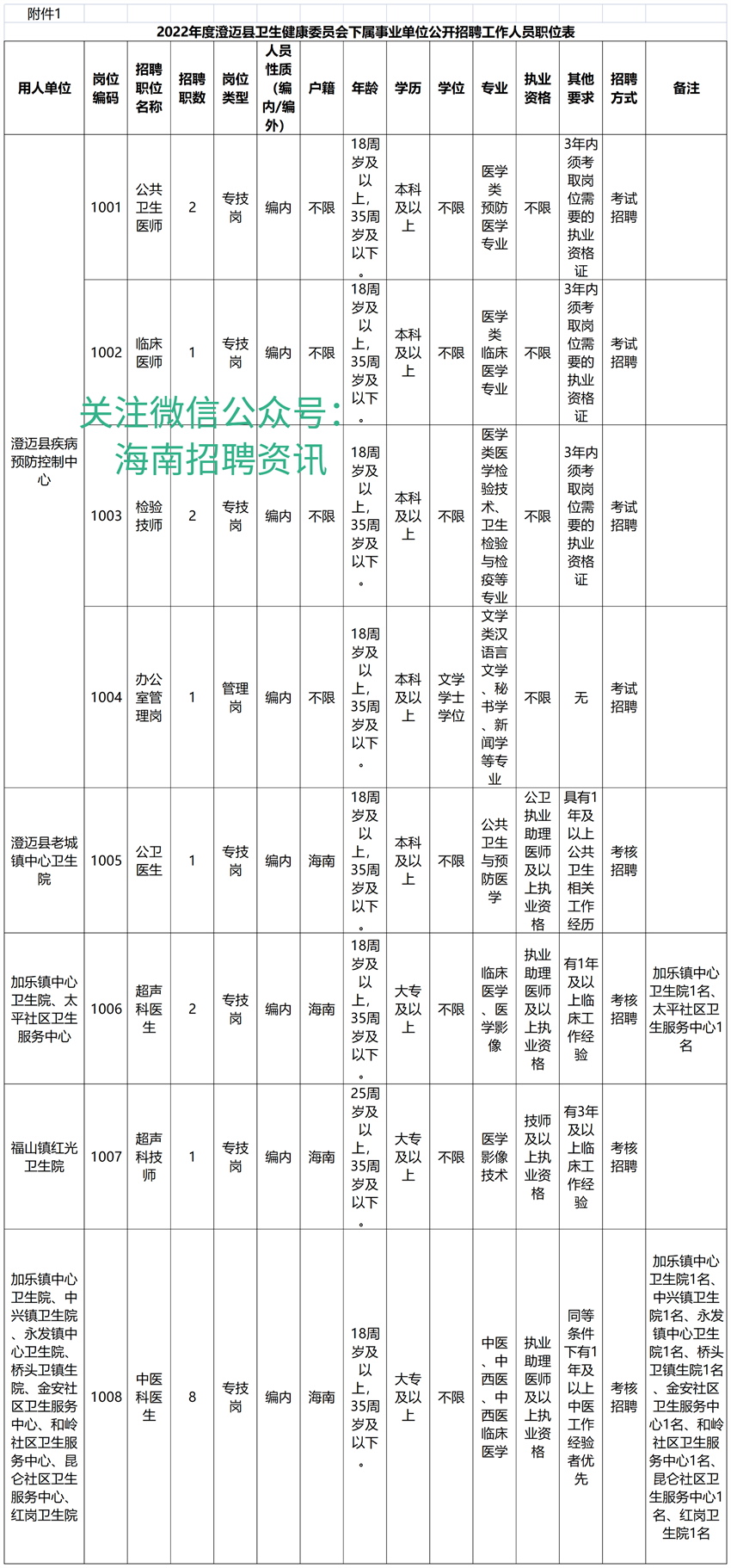 (1)采用考核招聘的岗位详见《2022年度澄迈县卫生健康委员会下属单位公开招聘工作人员职位表》。