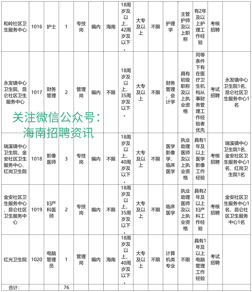 本次招聘职位共计76名,招聘具体岗位、资格条件等详见《2022年度澄迈县卫生健康委员会下属单位公开招聘工作人员职位表》。