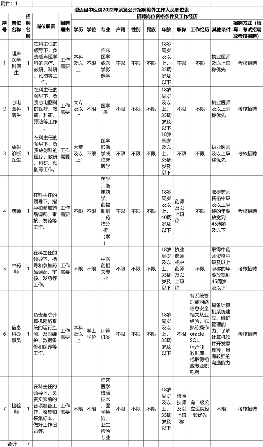 本次面向全国紧急公开招聘编外人员7人。具体招聘岗位(详见附件1澄迈县中医院2022年紧急公开招聘编外工作人员职位表)。