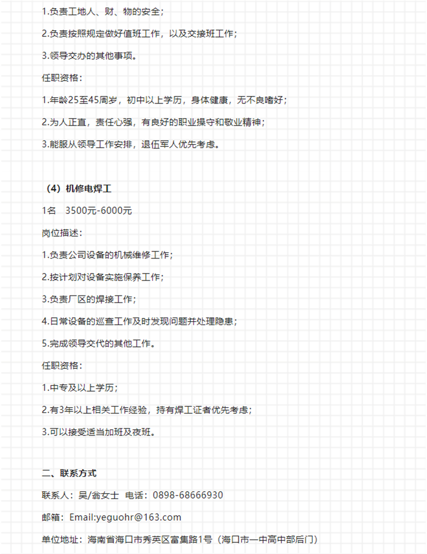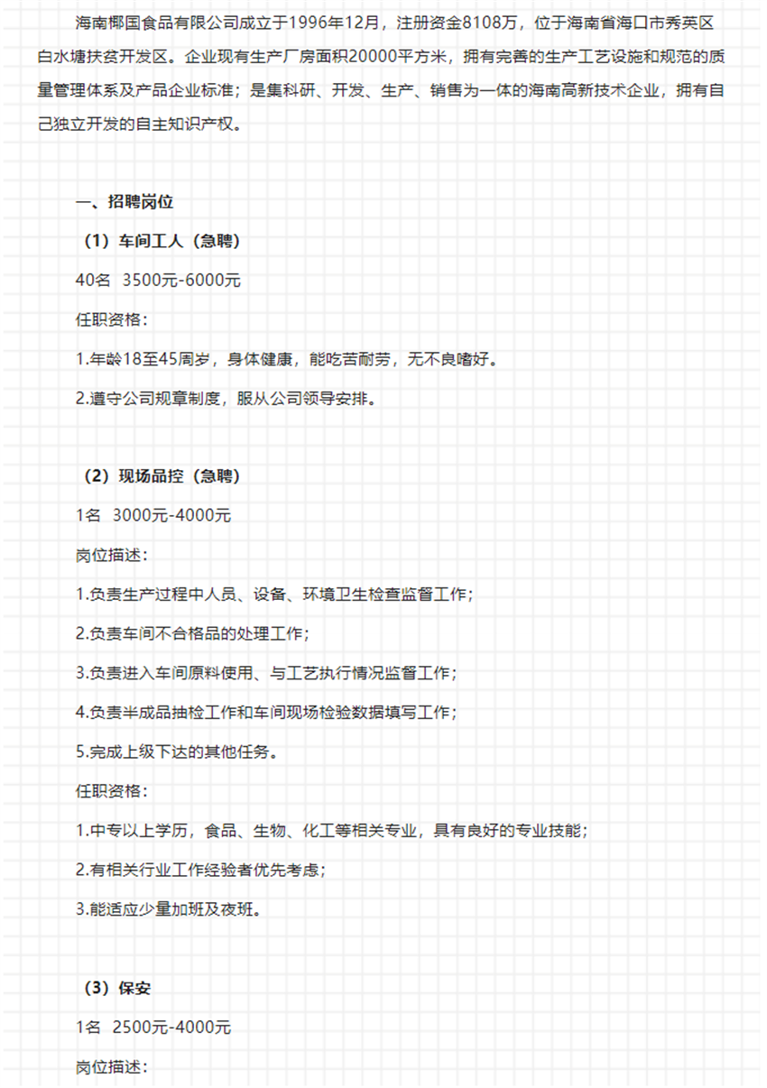 4个岗位招43人丨海南椰国食品有限公司招聘公告