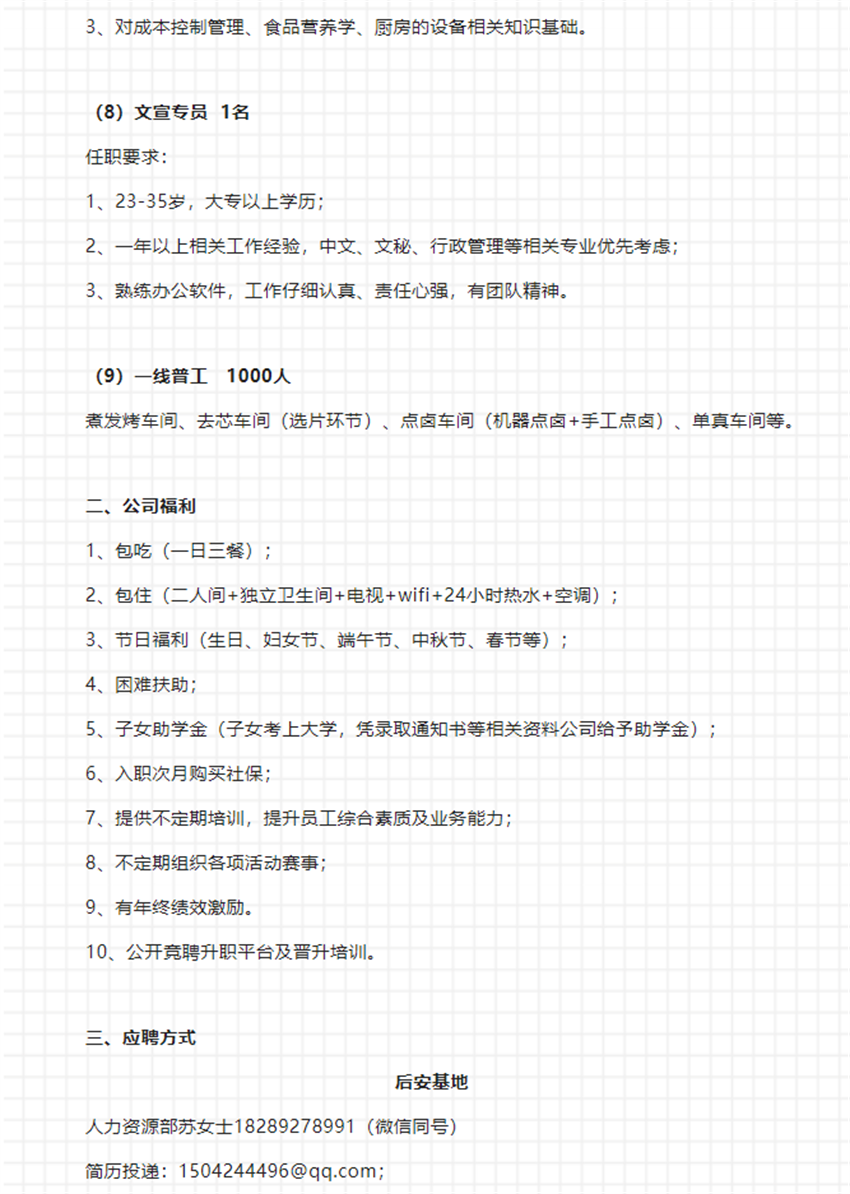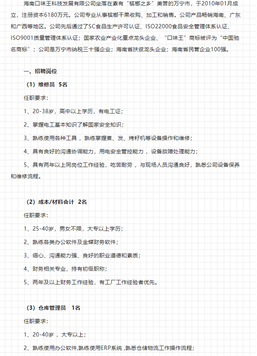9个岗位招1017人丨海南口味王科技发展有限公司招聘公告