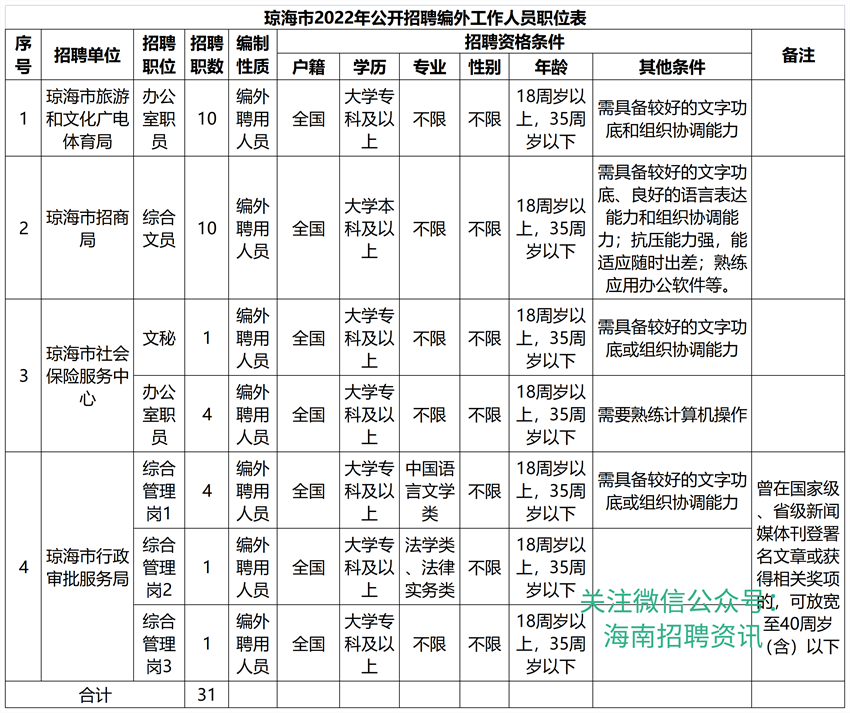 招聘公告通过琼海市人民政府门户网站(http://qionghai.hainan.gov.cn/)、海南自贸港招聘网(https://www.ihnhr.com/)向社会公布。公告时间:2022年9月27日—10月3日,共7天。各招聘单位具体的招聘职位、招聘职数、报考资格条件和有关要求等详见《琼海市2022年公开招聘编外工作人员职位表》。