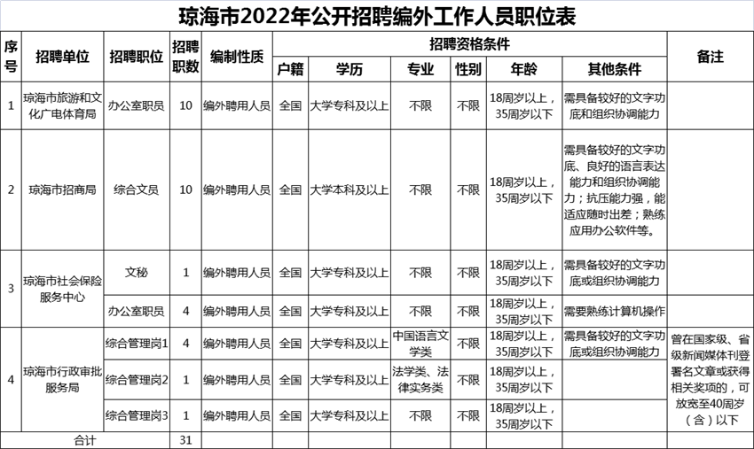 共招聘31名编外工作人员(具体见职位表)。