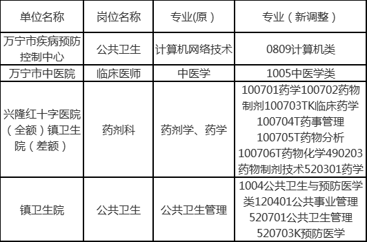 四、因招聘工作需要,根据国家教育部专业目录将《万宁市2022年考核招聘急需紧缺医疗卫生专业技术人才和公开招聘医疗卫生专业技术人才的公告(第1号)》中附件2《万宁市卫生健康委员会公开招聘医疗卫生专业技术人才岗位设置表》部分专业要求做如下调整: