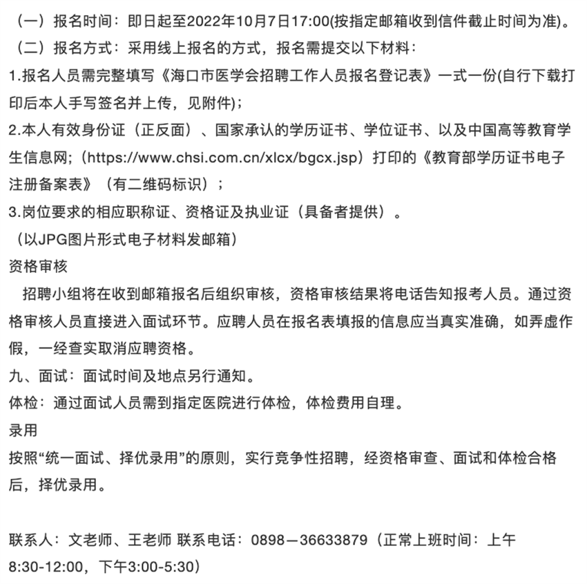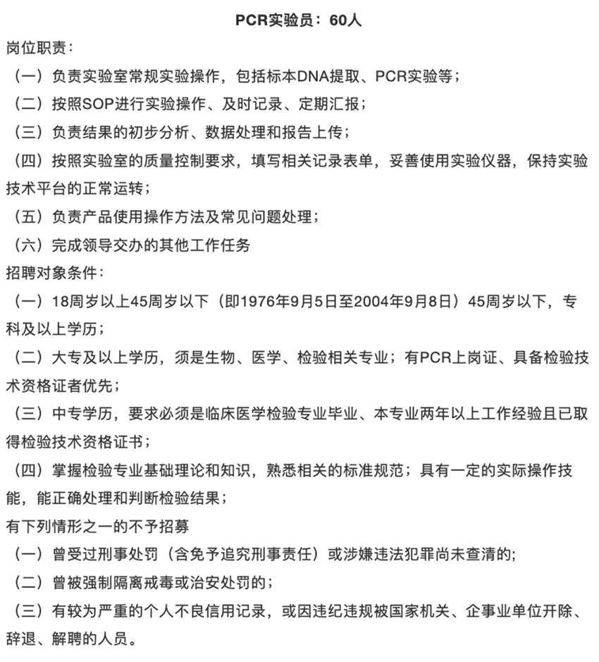 为加强新冠肺炎疫情防控工作,提高我市核酸检测能力,储备检验技术力量,海口市医学会受海口市卫健委委托,现继续面向社会招聘核酸检测检验人员(以下简称PCR实验员),现将有关事宜公告如下: