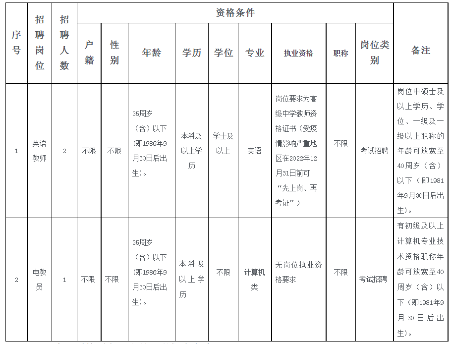 招聘英语教师2名,电教员1名,均为专业技术岗位。