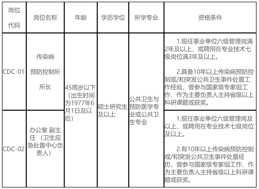 为加快海南自贸港建设,加强卫生人才引进,高标准建设省级疾控中心,我中心决定面向全国公开选聘1名传染病预防控制所所长(五级管理岗)和1名办公室副主任(卫生应急处置中心负责人,六级管理岗)。