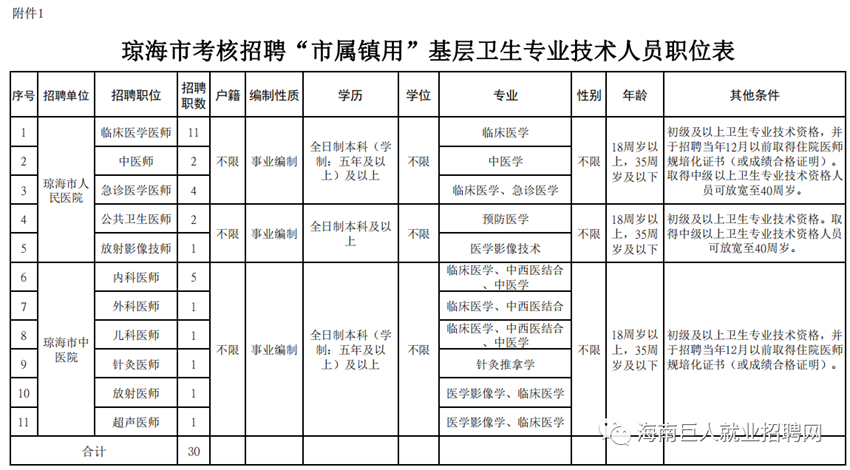 共招聘30名卫生专业技术人员(职位表详见附件)。