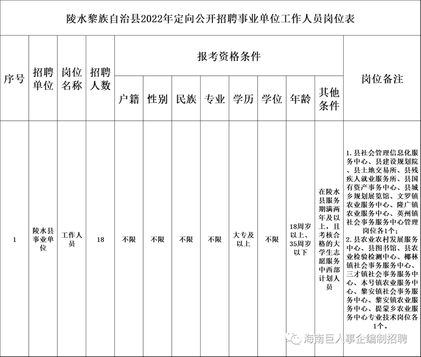 陵水黎族自治县2022年定向公开招聘事业单位工作人员公告(一)